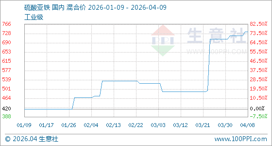 4月9日,生意社硫酸亚铁基准价为735.00元/吨,与本月初(705.00元/吨)相比,上涨了4.26%。