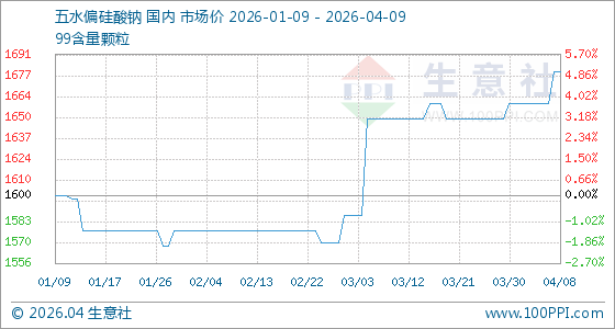 4月9日,生意社五水偏硅酸钠基准价为1680.00元/吨,与本月初(1660.00元/吨)相比,上涨了1.20%。
