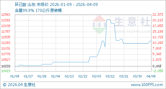 4月9日,生意社环己胺基准价为11366.67元/吨,与本月初(11266.67元/吨)相比,上涨了0.89%。
