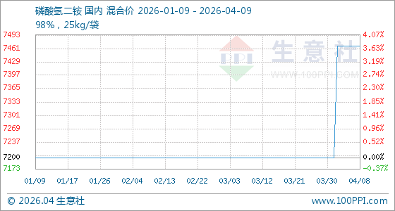 4月9日,生意社磷酸氢二铵基准价为7466.67元/吨,与本月初(7200.00元/吨)相比,上涨了3.70%。