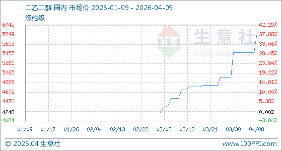 4月9日,生意社二乙二醇基准价为5881.67吨,与本月初(5481.67吨)相比,上涨了7.30%。