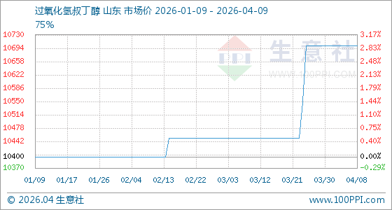 4月9日,生意社过氧化氢叔丁醇基准价为10700.00元/吨,与本月初持平。