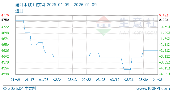 4月9日生意社阔叶木浆基准价为4626.67元/吨