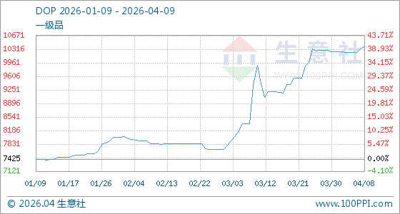 4月9日,生意社DOP基准价为10375.83元/吨,与本月初(10259.17元/吨)相比,上涨了1.14%。