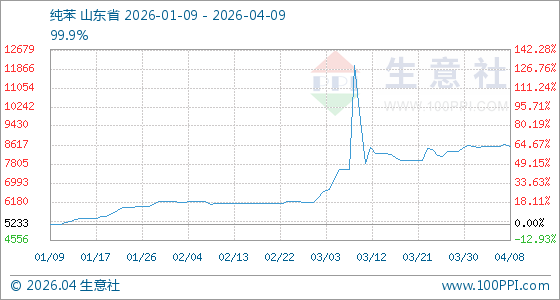 4月9日,生意社纯苯基准价为8536.67元/吨,与本月初(8586.67元/吨)相比,下降了0.58%。