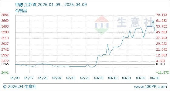 4月9日,生意社甲醇基准价为3313.33元/吨,与本月初(3356.67元/吨)相比,下降了1.29%。