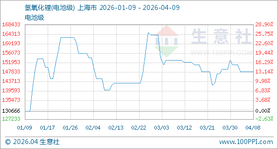 4月9日生意社氢氧化锂(电池级)基准价为148000.00元/吨