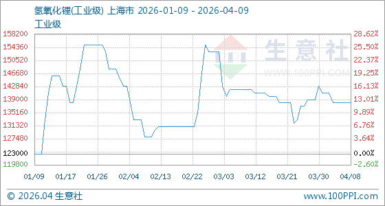 4月9日生意社氢氧化锂(工业级)基准价为138000.00元/吨