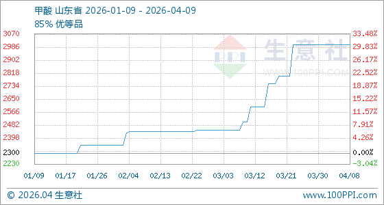 4月9日,生意社甲酸基准价为3000.00元/吨,与本月初持平。