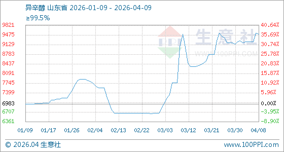 4月9日,生意社异辛醇基准价为9500.00元/吨,与本月初(9233.33元/吨)相比,上涨了2.89%。