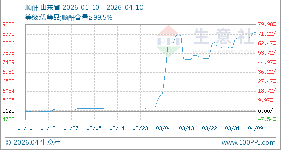 4月10日,生意社顺酐基准价为8850.00元/吨,与本月初(8150.00元/吨)相比,上涨了8.59%。