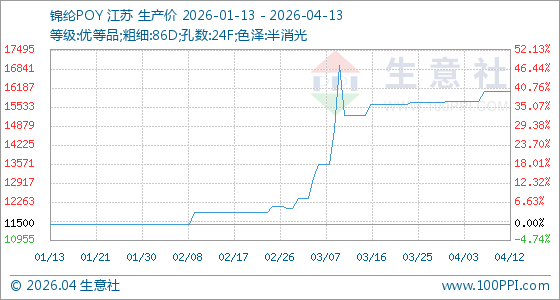4月13日,生意社锦纶POY基准价为16050.00元/吨,与本月初(15725.00元/吨)相比,上涨了2.07%。