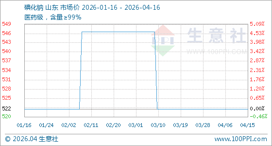 4月16日,生意社碘化钠基准价为522.50元/千克,与本月初持平。