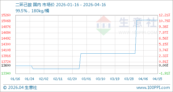 4月16日,生意社二环己胺基准价为15100.00元/吨,与本月初(14000.00元/吨)相比,上涨了7.86%。