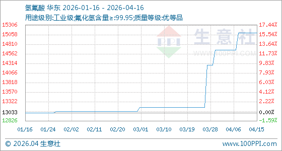 4月16日生意社氢氟酸基准价为15100.00元/吨