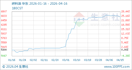 4月16日,生意社燃料油基准价为6612.50元/吨,与本月初(6587.50元/吨)相比,上涨了0.38%。