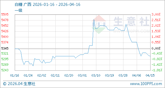 4月16日,生意社白糖基准价为5310.00元/吨,与本月初(5440.00元/吨)相比,下降了2.39%。