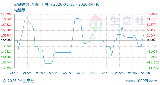 4月16日生意社碳酸锂(电池级)基准价为162000.00元/吨