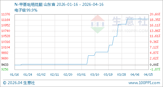 4月16日,生意社N-甲基吡咯烷酮基准价为11200.00元/吨,与本月初(11000.00元/吨)相比,上涨了1.82%。