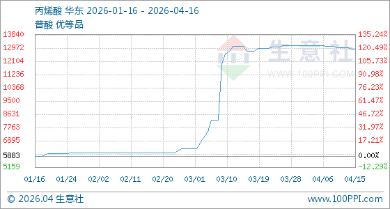 4月16日,生意社丙烯酸基准价为12883.33元/吨,与本月初(13116.67元/吨)相比,下降了1.78%。