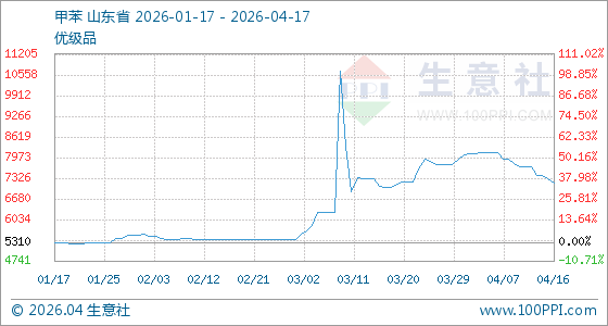4月17日,生意社甲苯基准价为7157.67元/吨,与本月初(8067.67元/吨)相比,下降了11.28%。