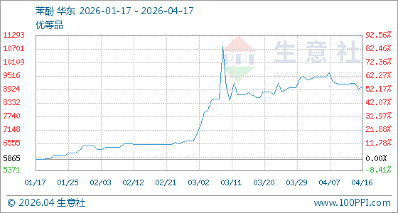 4月17日,生意社苯酚基准价为9025.00元/吨,与本月初(9487.50元/吨)相比,下降了4.87%。
