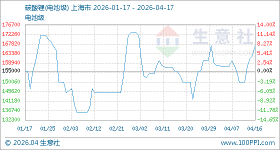 4月17日生意社碳酸锂(电池级)基准价为167000.00元/吨
