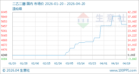 4月20日,生意社二乙二醇基准价为5548.33吨,与本月初(5481.67吨)相比,上涨了1.22%。