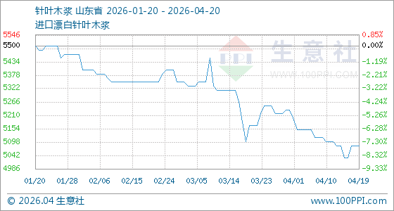 4月20日,生意社针叶木浆基准价为5083.33元/吨,与本月初(5233.33元/吨)相比,下降了2.87%。