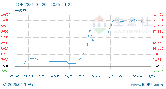4月20日,生意社DOP基准价为10284.17元/吨,与本月初(10259.17元/吨)相比,上涨了0.24%。