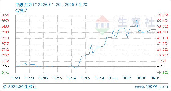 4月20日,生意社甲醇基准价为3390.00元/吨,与本月初(3356.67元/吨)相比,上涨了0.99%。