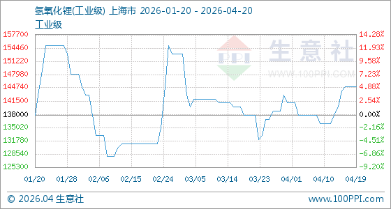 4月20日生意社氢氧化锂(工业级)基准价为145000.00元/吨