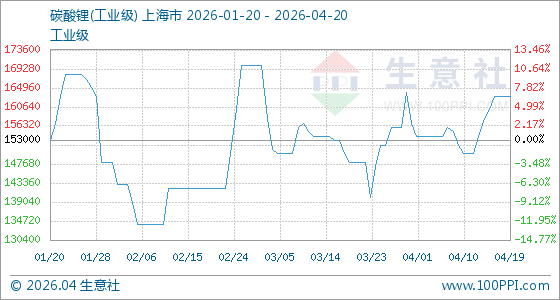 4月20日生意社碳酸锂(工业级)基准价为163000.00元/吨