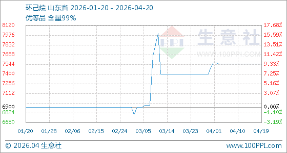 4月20日,生意社环己烷基准价为7550.00元/吨,与本月初(7500.00元/吨)相比,上涨了0.67%。