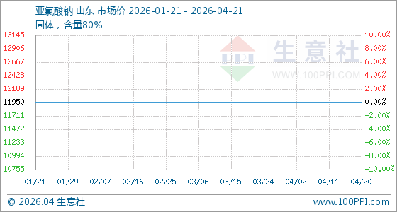 4月21日,生意社亚氯酸钠基准价为11950.00元/吨,与本月初持平。