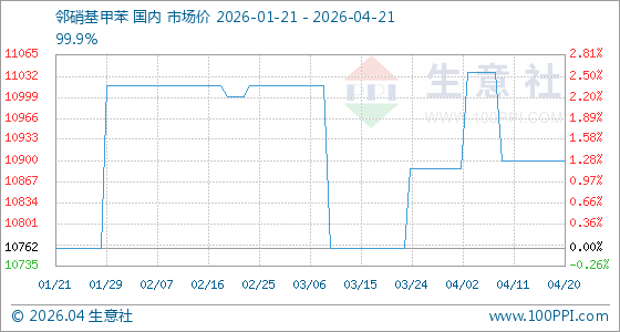 4月21日,生意社邻硝基甲苯基准价为10900.00元/吨,与本月初(10887.50元/吨)相比,上涨了0.11%。