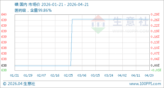 4月21日,生意社碘基准价为640.00元/千克,与本月初持平。