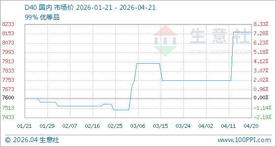 4月21日,生意社D40基准价为8166.67元/吨,与本月初(7750.00元/吨)相比,上涨了5.38%。