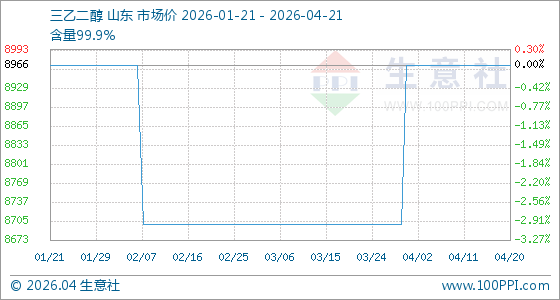 4月21日,生意社三乙二醇基准价为8966.67元/吨,与本月初持平。