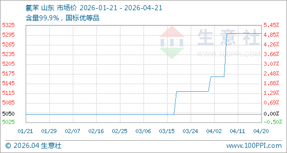 4月21日,生意社氯苯基准价为5300.00元/吨,与本月初(5120.00元/吨)相比,上涨了3.52%。