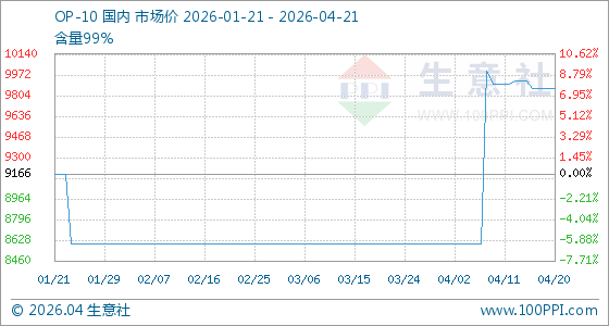 4月21日,生意社OP-10基准价为9860.00元/吨,与本月初(8600.00元/吨)相比,上涨了14.65%。