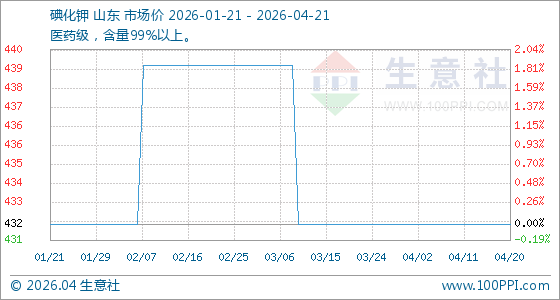 4月21日,生意社碘化钾基准价为432.00元/公斤,与本月初持平。