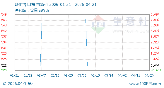 4月21日,生意社碘化钠基准价为522.50元/千克,与本月初持平。