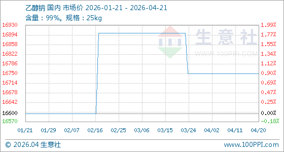 4月21日,生意社乙醇钠基准价为16750.00元/吨,与本月初持平。