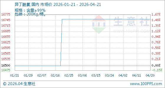 4月21日,生意社异丁酰氯基准价为16750.00元/吨,与本月初持平。
