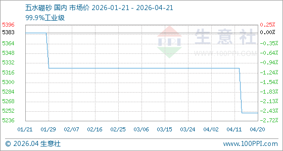 4月21日生意社五水硼砂基准价为5250.00元/吨