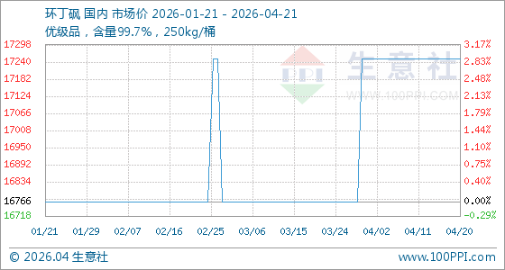 4月21日,生意社环丁砜基准价为17250.00元/吨,与本月初持平。
