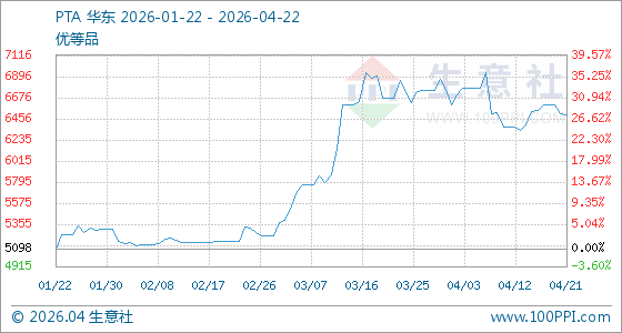 4月22日,生意社PTA基准价为6497.66元/吨,与本月初(6761.93元/吨)相比,下降了3.91%。