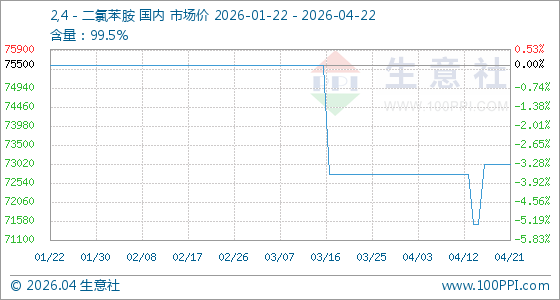 4月22日,生意社2,4-二氯苯胺基准价为73000.00元/吨,与本月初(72750.00元/吨)相比,上涨了0.34%。