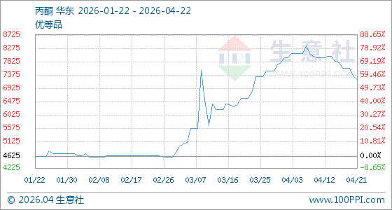 4月22日,生意社丙酮基准价为7200.00元/吨,与本月初(7800.00元/吨)相比,下降了7.69%。